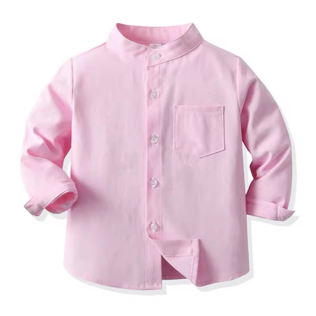 This product is a solid color boy shirt with a button down Mandarin collar and...