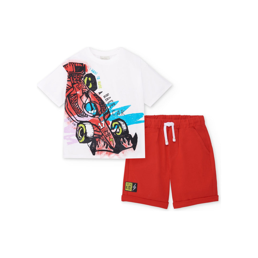 Two-piece knitted set for boys. White T-shirt with racing print. Red Bermuda shorts with elastic...