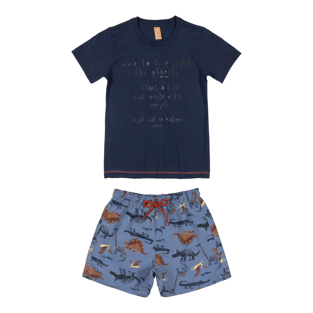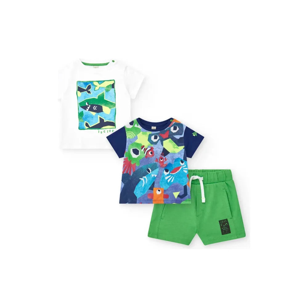 Knit t-shirt for boys in blue with a shark, fish, and other marine elements print...