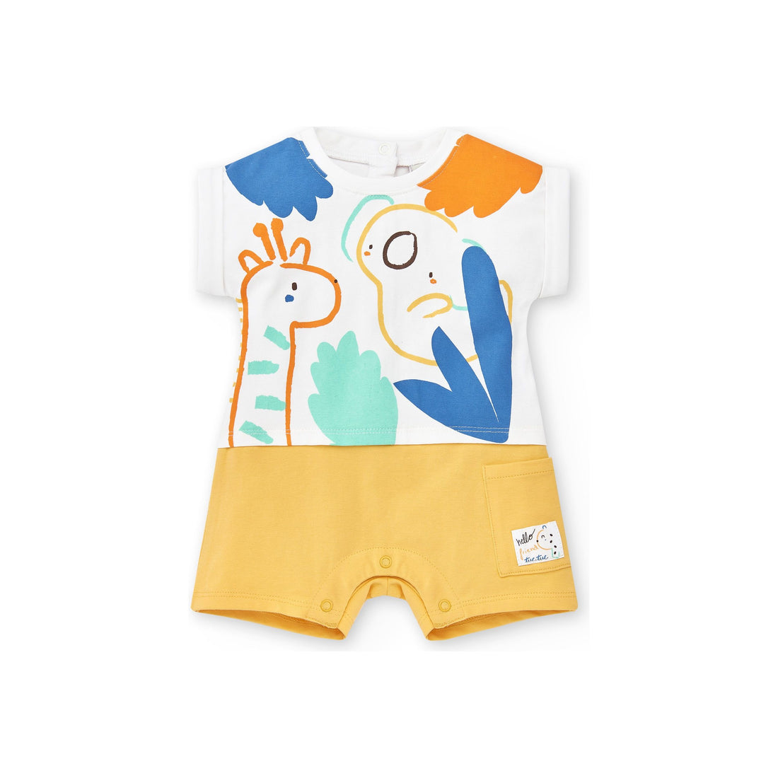 White knitted romper with animal print, and yellow with side pocket and opening at the...