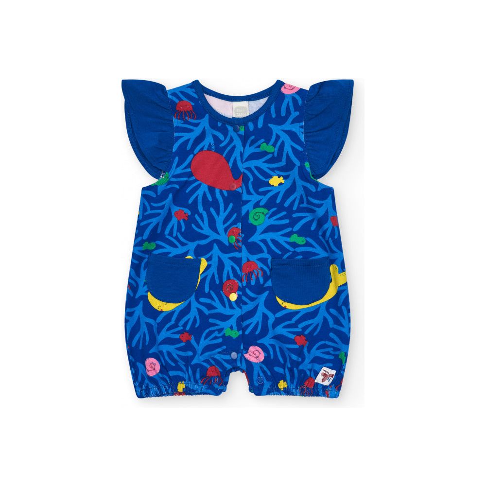 Knit romper for girls in blue with a marine print including corals, fish, and shells...