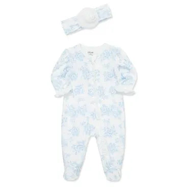 A pretty blue rose print covers this newborn footie and headband set for your baby...