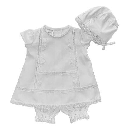Pique A-line top with lace details, delicate pattern and side bow. Includes panty and bonnet. ...