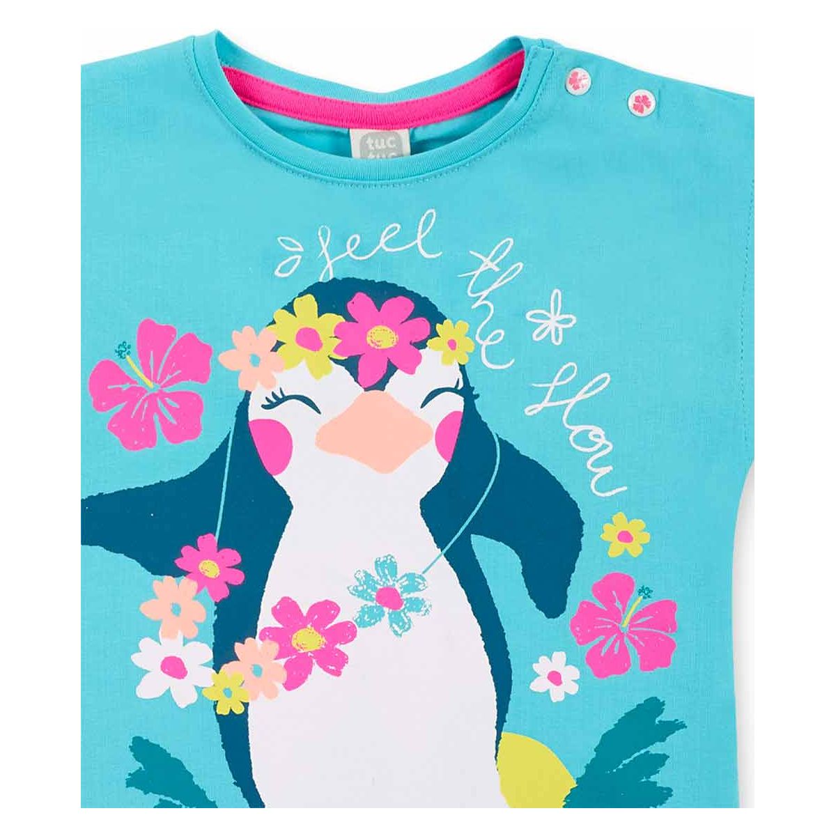 Two-piece knitted set for girls. Blue t-shirt with penguin print. Fuchsia pirate legging with colorful flower print. Collection Laguna Beach