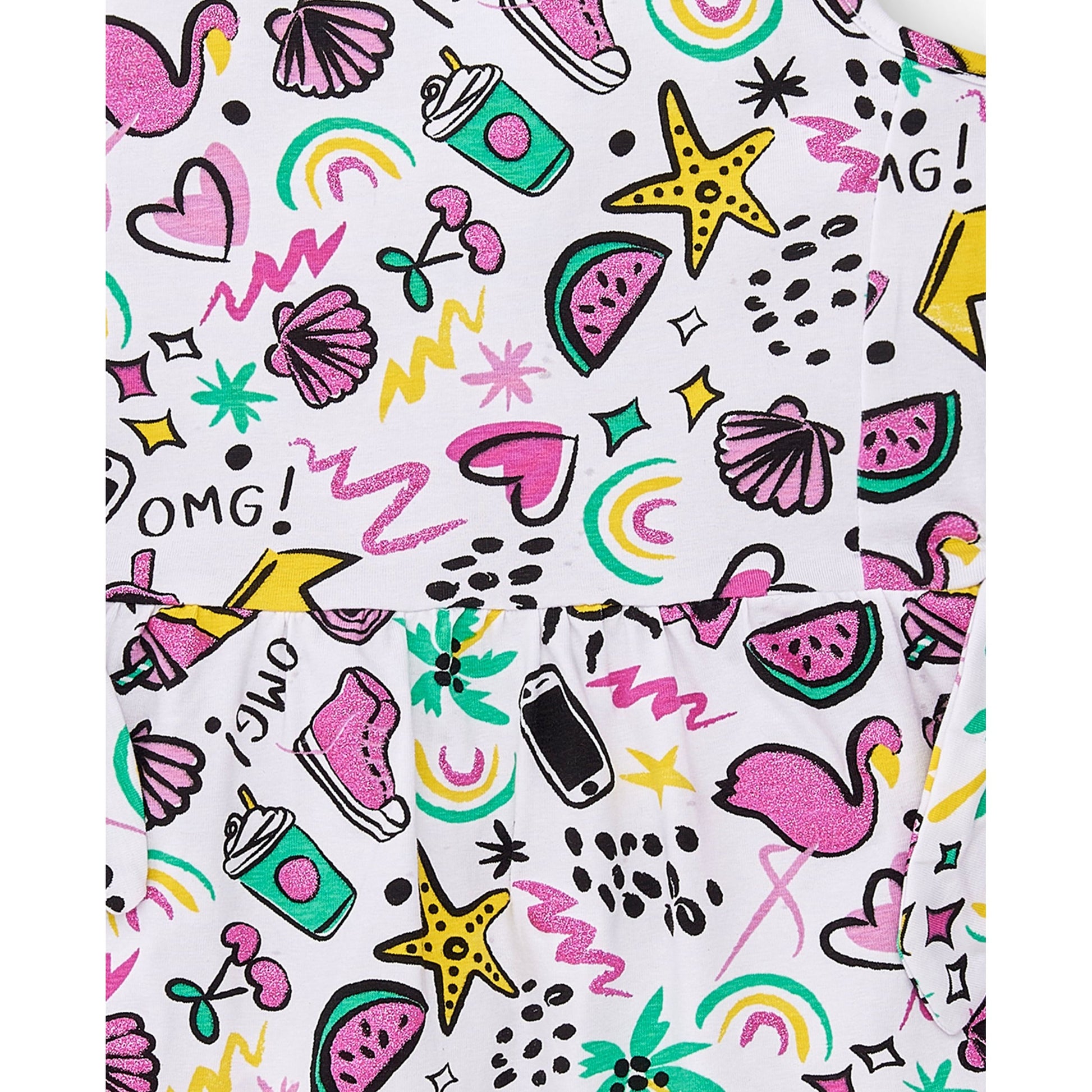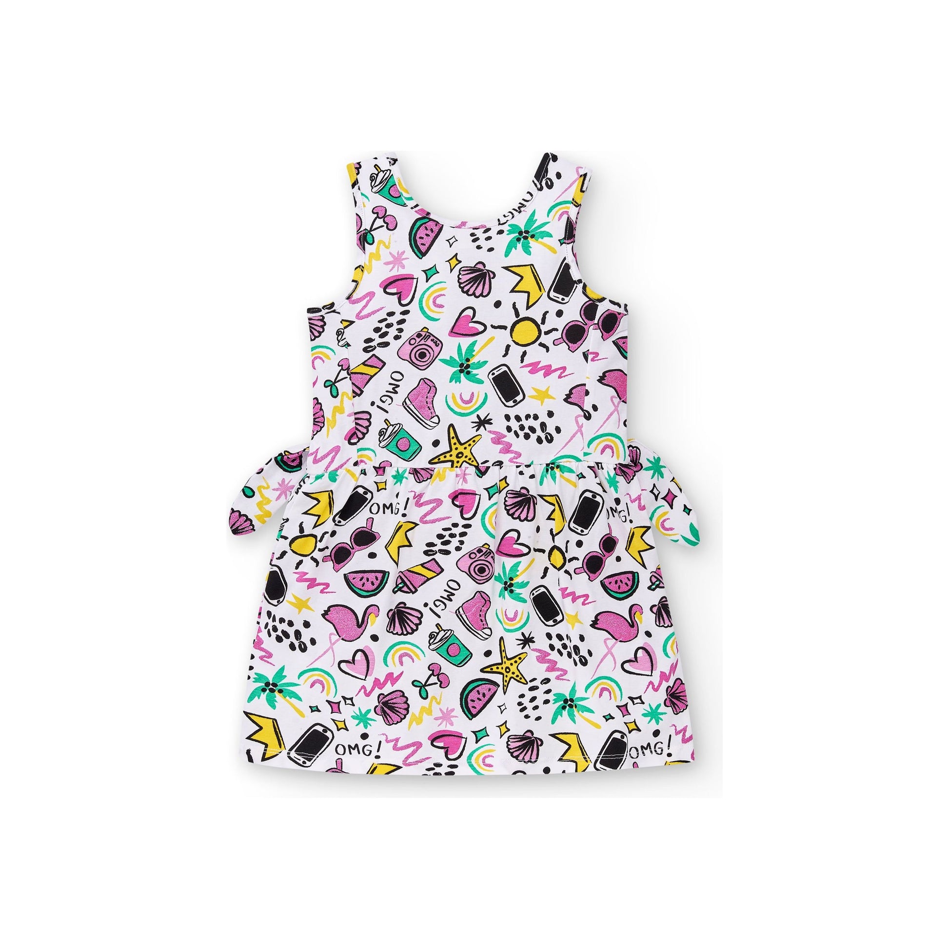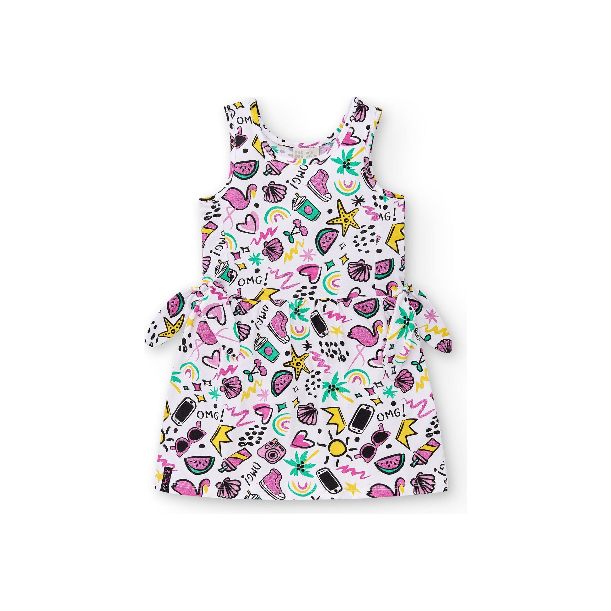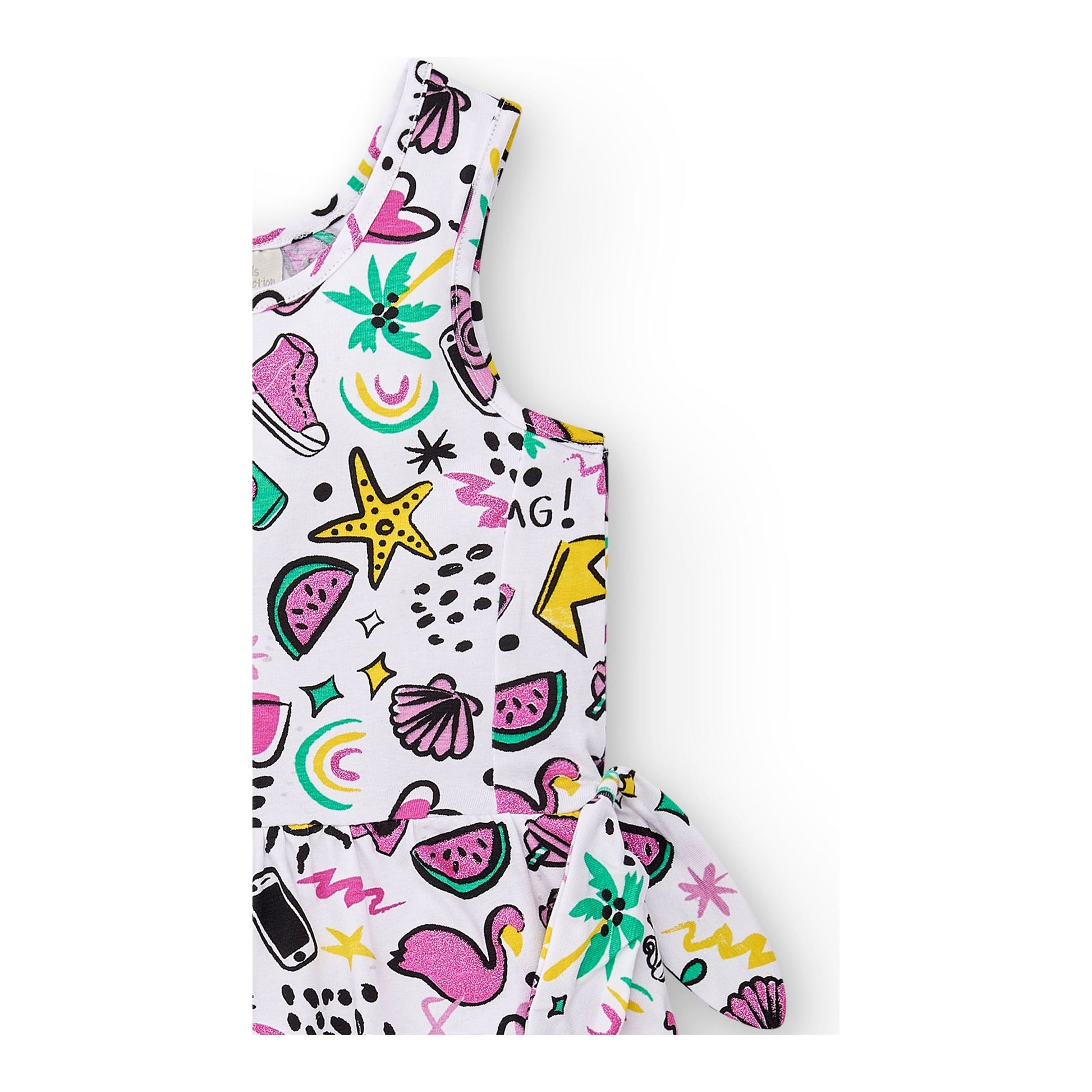 White knitted tank dress with a colorful summer print and decorative knot appliqué on the sides for a girl. Collection Flamingo Mood