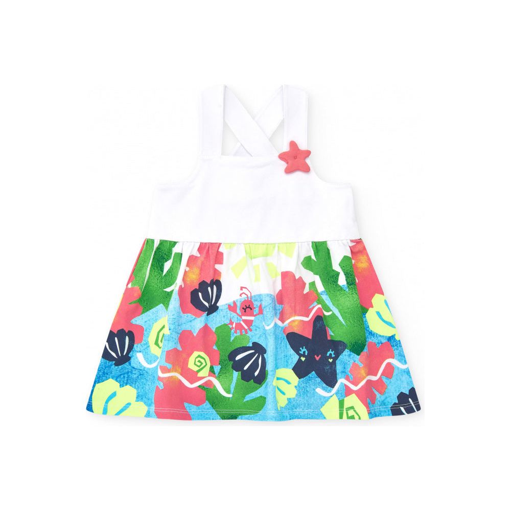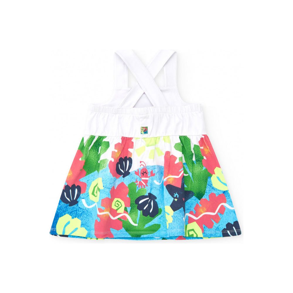 Knit dress for girls with crisscrossed straps in white and a skirt with a floral print in green, red, blue, and yellow tones. Collection Color the Sea.