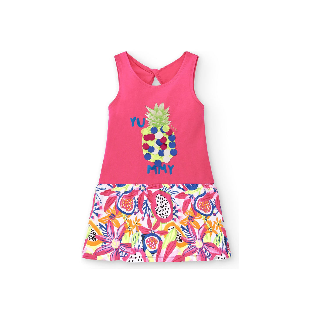 Fuchsia pink knitted strap dress with pineapple print and sequin appliqué for girl. Collection Acid...