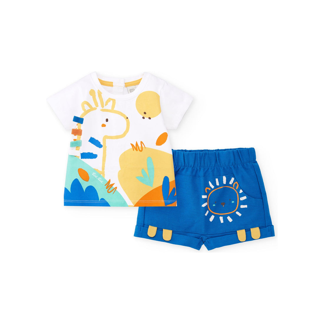 Two-piece knitted set for boys. White T-shirt with animal print. Blue Bermuda shorts with sun...