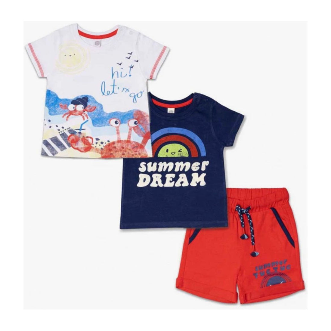 Three-piece knitted set for a boy. Blue t-shirt with 'summer dream' lettering and white t-shirt...