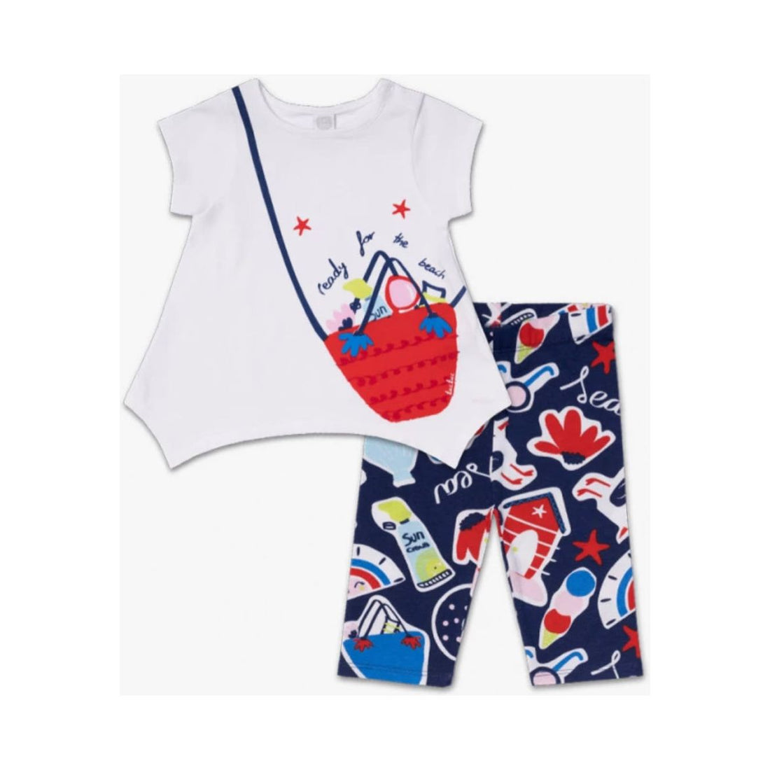 Two-piece knitted set for a girl. White t-shirt with bag design. Blue pirate leggings with...