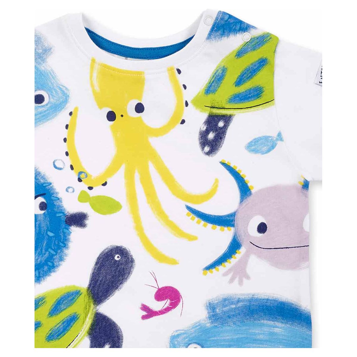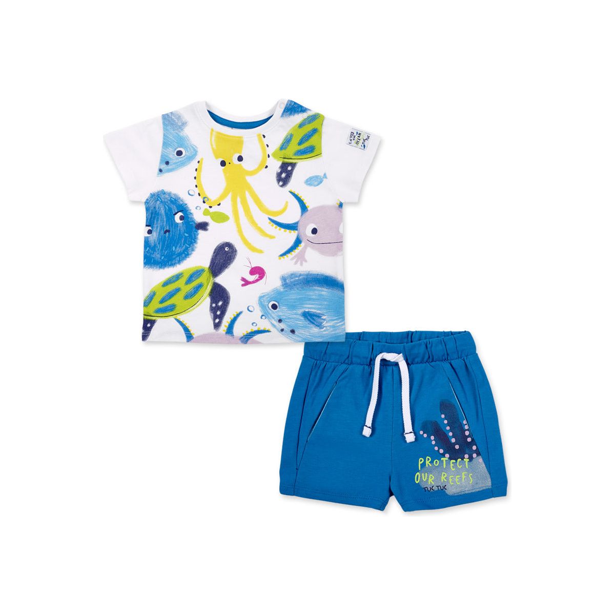 Two-piece knitted set for boys. White t-shirt with marine animal print. Blue Bermuda shorts with elastic waist and drawstring. Ocean Wonders collection Ocean Wonders collection