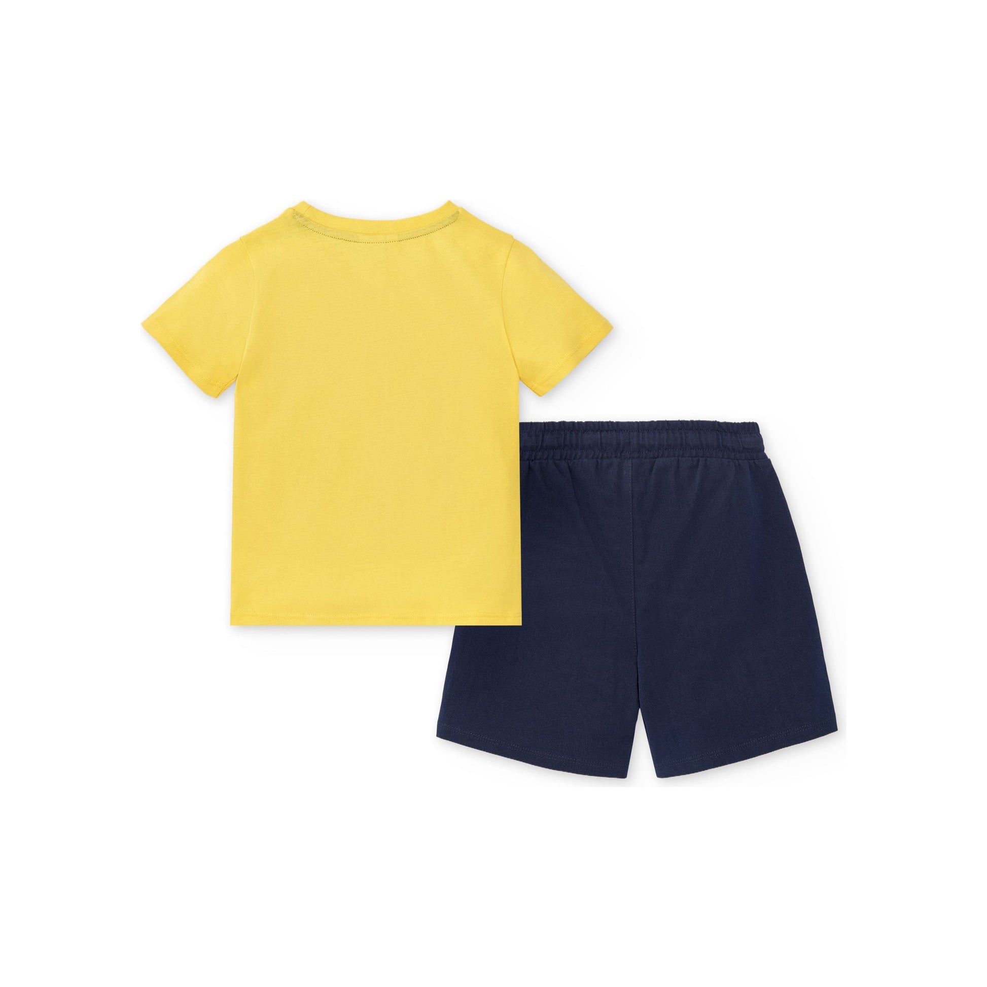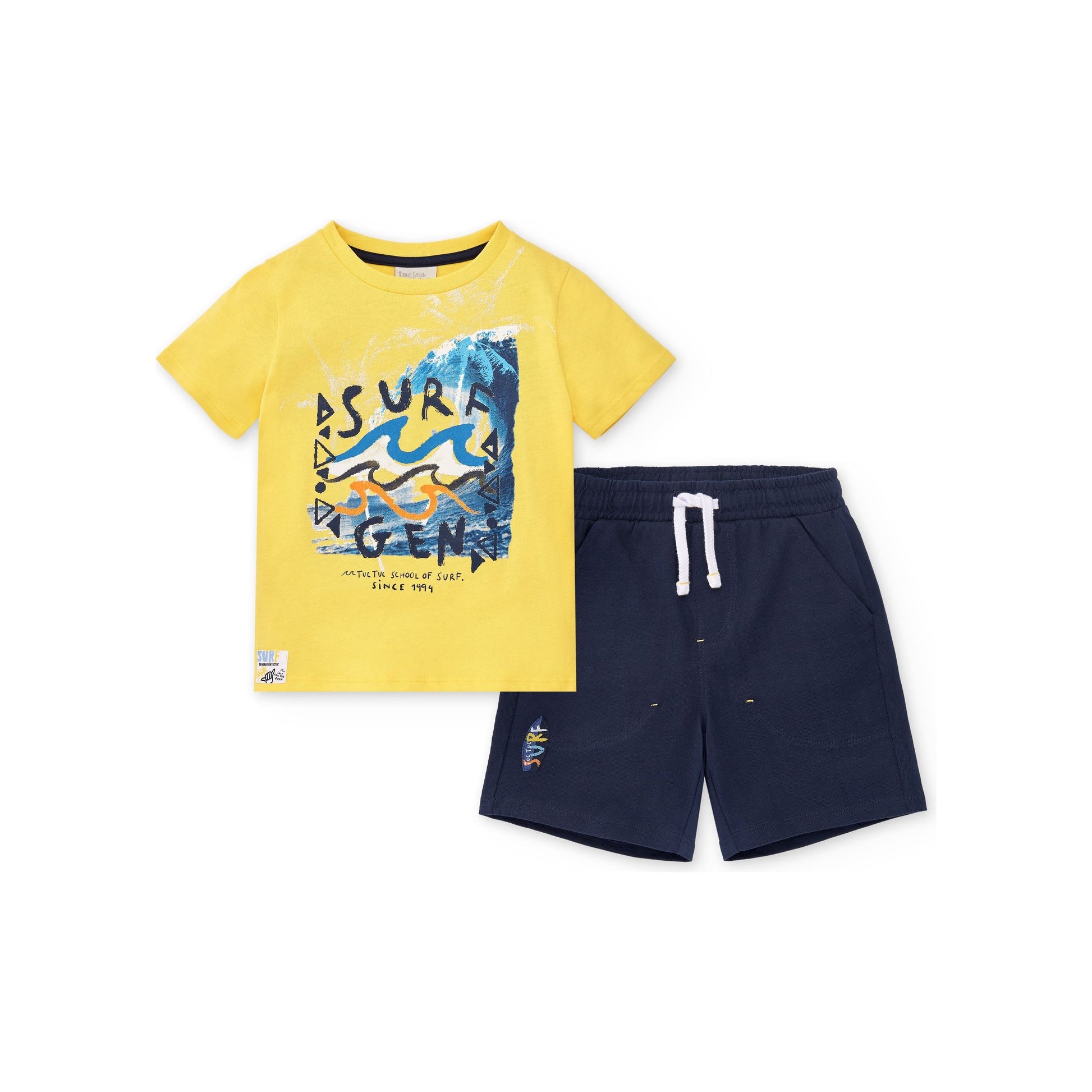 Two-piece knitted set for boys. Yellow t-shirt with wave print. Navy blue Bermuda shorts with elastic waist and drawstring. Collection Sons Of Fun