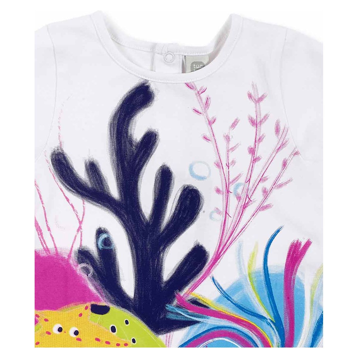 Two-piece knitted set for girls. White t-shirt with seaweed and fish print. Lilac pirate legging with printed motif on the side. Ocean Wonders collection Ocean Wonders collection